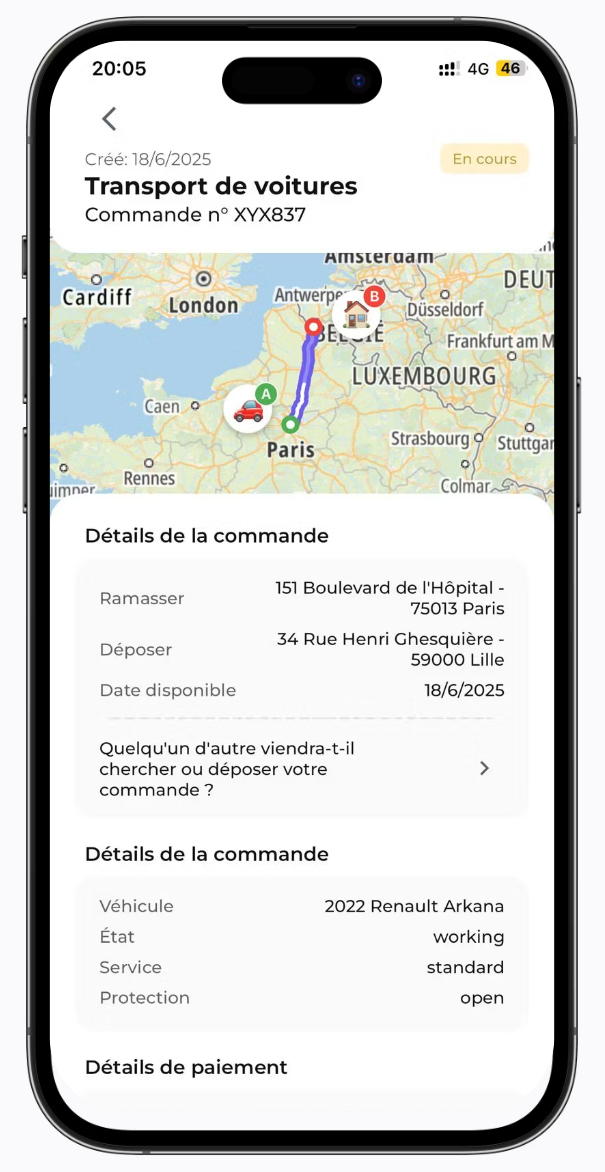 Suivez chaque étape du transport de votre véhicule en temps réel, du retrait à la livraison. Grâce à notre interface, vous gardez toujours un œil sur vos véhicules ou marchandises.