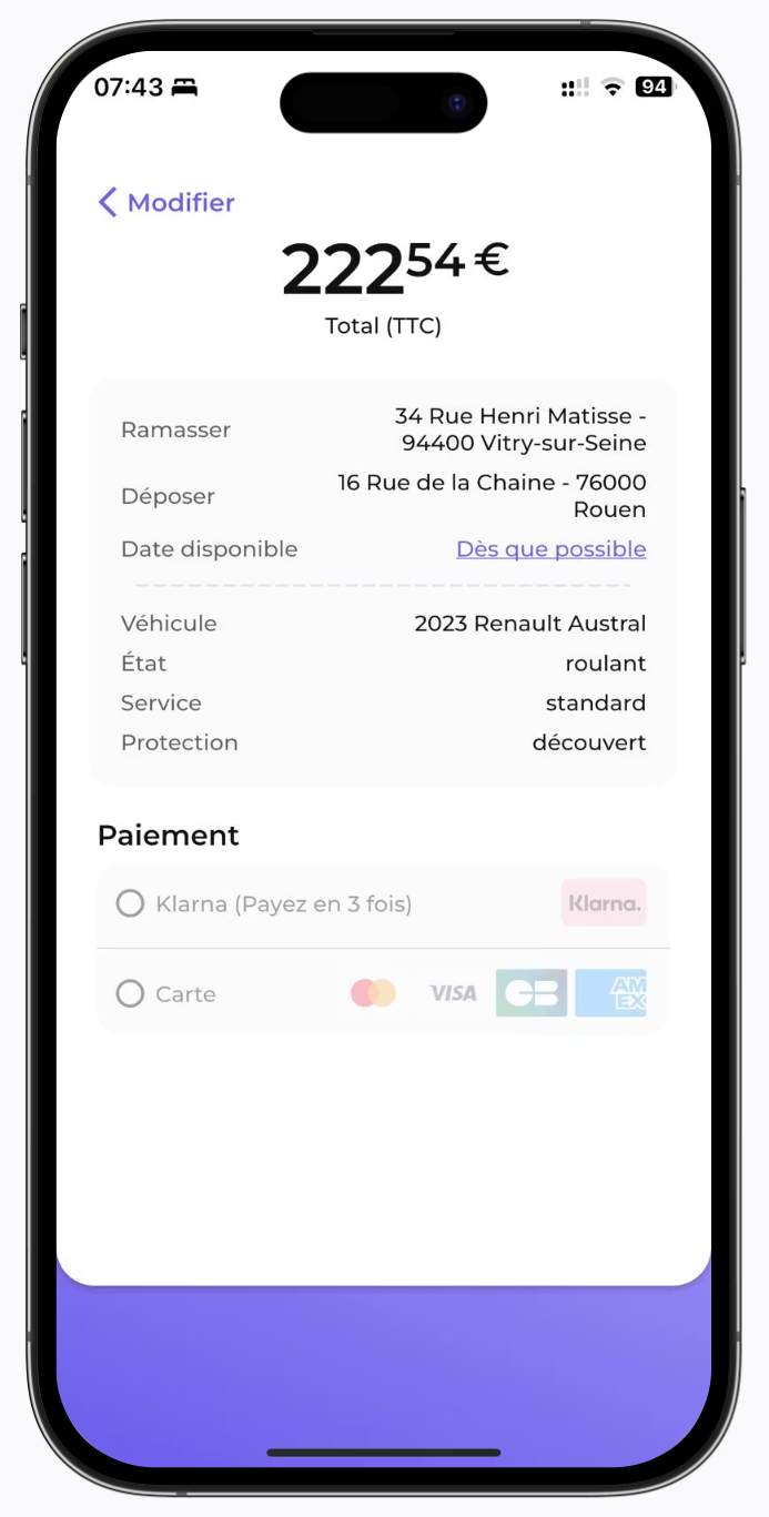 Réglez vos services y compris le transport de votre voiture en 3 mensualités, sans frais, en toute sécurité grâce à Klarna.
